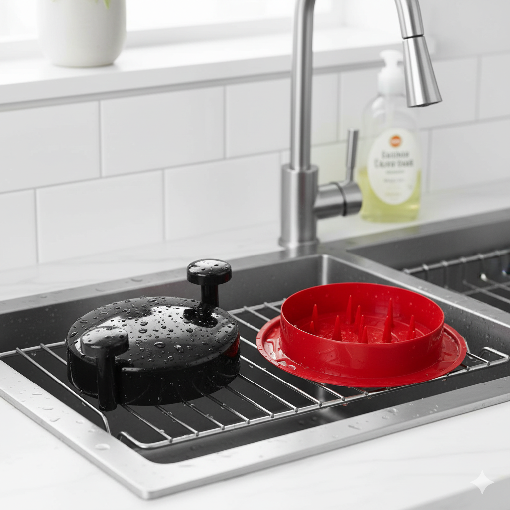 • Easy to use and clean: Just place the chicken in the container, close the lid and turn. The ergonomic design ensures simple and comfortable handling. In addition, its resistant material allows for quick and hassle-free cleaning – it can even be put in the dishwasher;